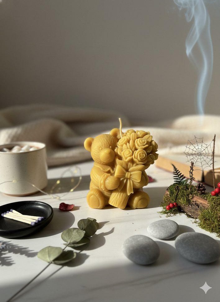 Pastel sarı renkte, gül buketi tutan ayıcık şeklinde şirin bir mum. ️ Doğal balmumundan yapılmıştır. Kraliçenin_arıları ig Beemine