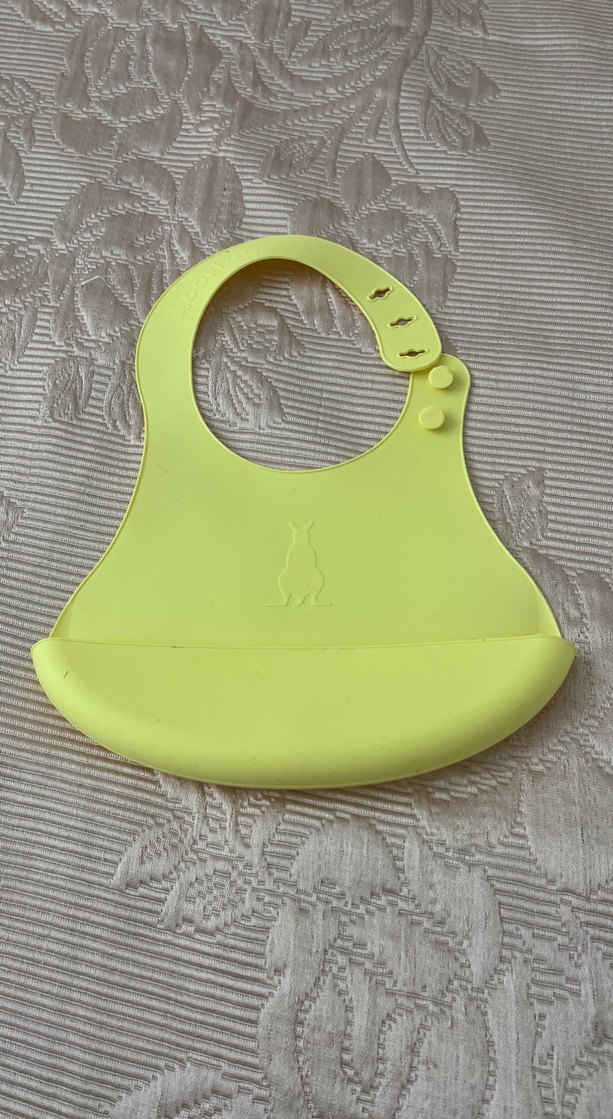 Pastel sarı renkte, yumuşak ve esnek yapıda, ayarlanabilir boyun kısmı ve yiyecek tutma cepli bebek mama önlüğü.
