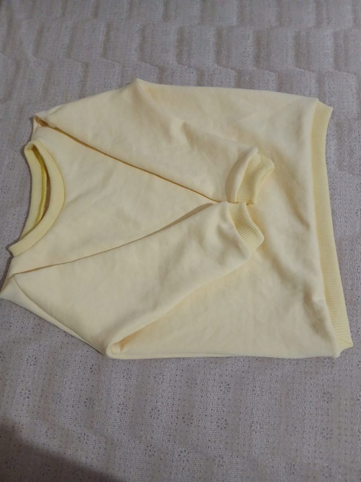 Sarı pastel renkte, uzun kollu, yuvarlak yaka ve rahat kesime sahip çocuk badisi. kendi dikimim hiç kullanılmadı yeni ürün