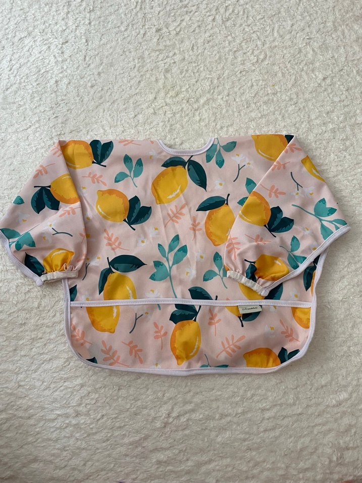 Pastel sarı renkli, limon desenli uzun kollu bebek önlüğü, önünde kolay temizlik için cep bulunur.
