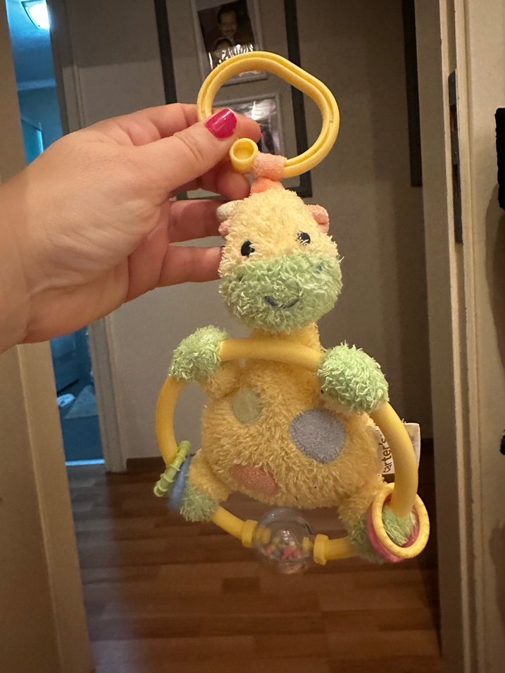Pastel sarı renkte, yumuşak zürafa peluşlu, dokulu kısımları ve tutması kolay halkaları olan asılanilen çıngıraklı oyuncak oyuncak.
