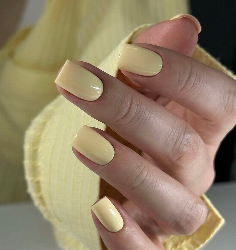 Pastel sarı renkte, parlak ve pürüzsüz görünümlü tırnak süslemeleri.