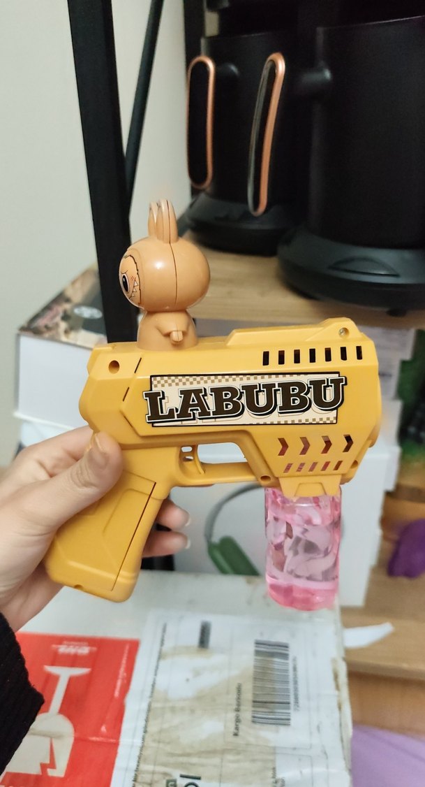 Pastel sarı renkli, üzerinde LABUBU yazısı ve üstünde küçük bir figür bulunan oyuncak tabanca. Altında şeffaf pembe bir haznesi var.