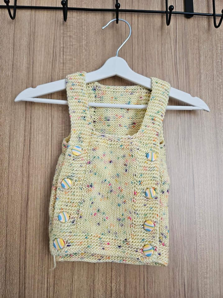 Renkli detaylı, yuvarlak yaka, pastel sarı örgü kız yelek. Salaş kesim, kolsuz ve bohem tarzda, düğmeli tasarım.