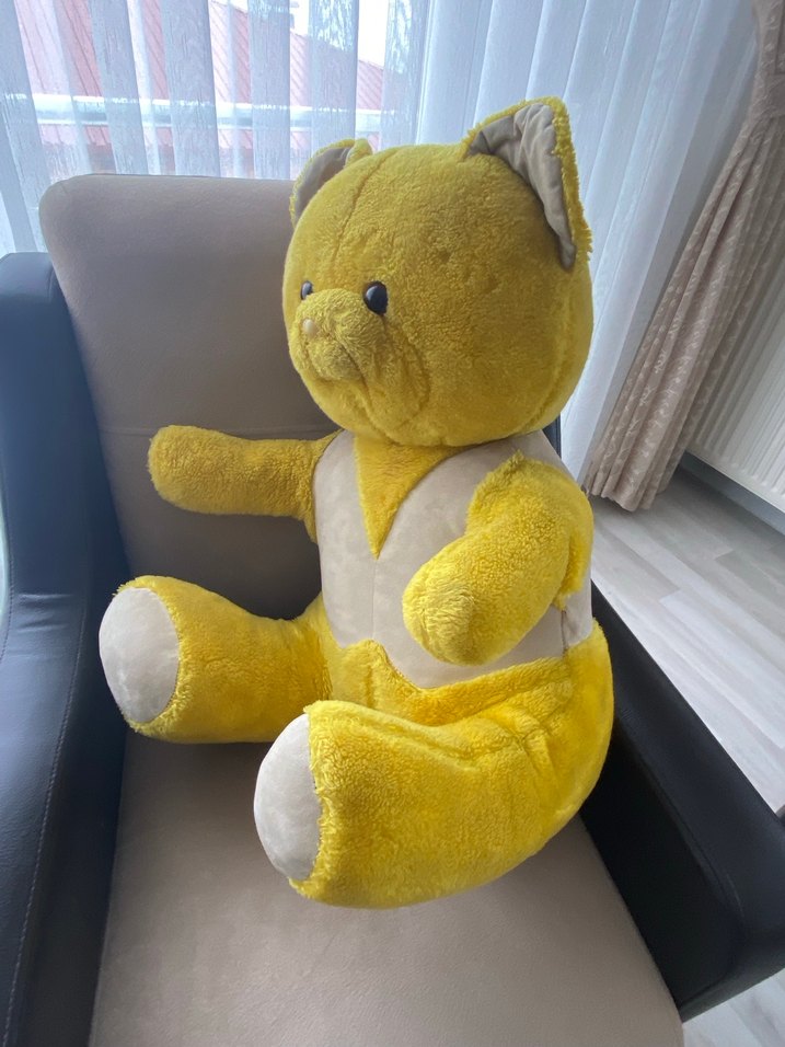 Pastel sarı renkte, yumuşak kumaştan yapılmış peluş ayı oyuncak, oturur pozisyondadır.