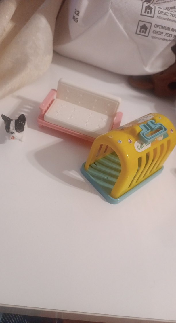 Pastel sarı renkte, mavi tabanlı ve üstünde kedi figürü bulunan taşınabilir küçük evcil hayvan taşıyıcısıdır.