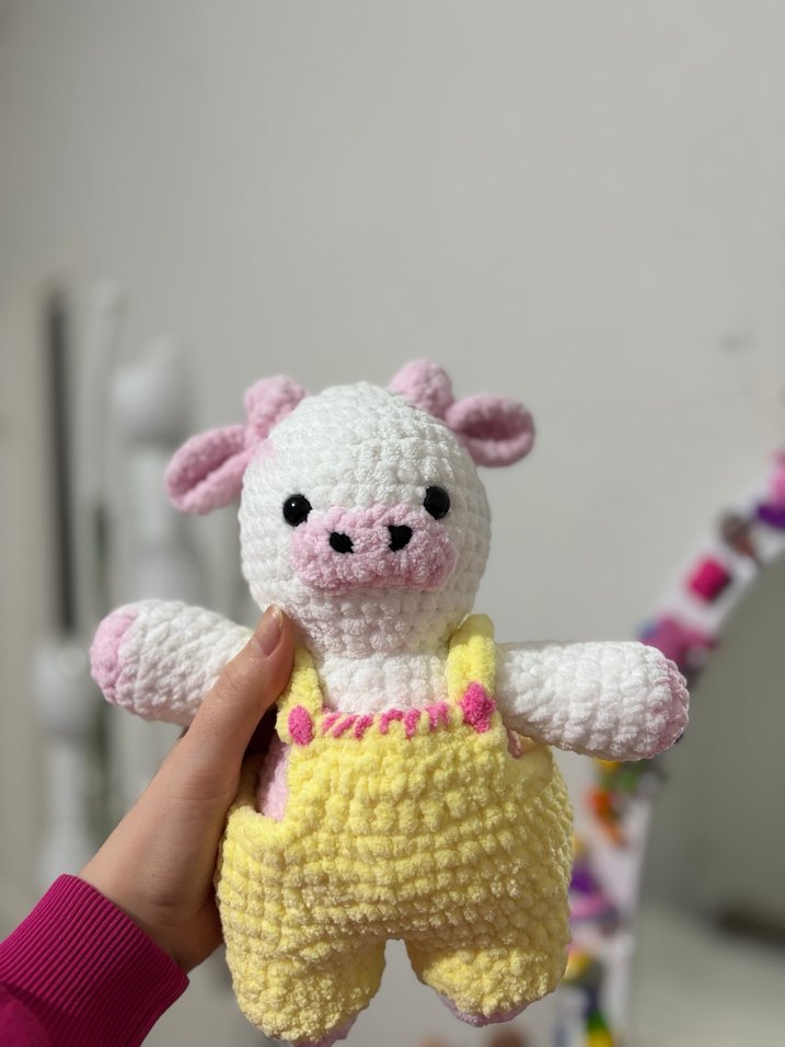 Pastel sarı tulum giymiş, beyaz ve pembe tığ işi hayvan figürlü yumuşak dokulu peluş oyuncak. Sevimli detaylarıyla dikkat çekiyor.