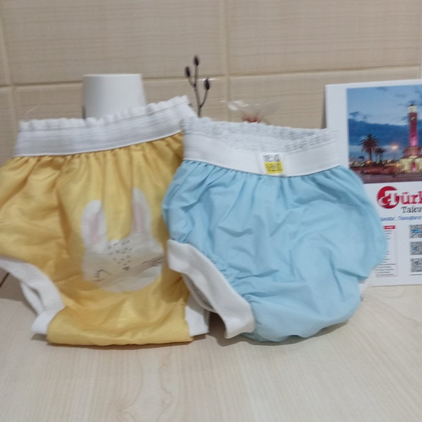 Yumuşak pastel sarı ve mavi çocuk iç çamaşırları, elastik bel bantlı. Sarı modelde hafif tavşan deseni bulunur. Rahat kullanım sağlar.