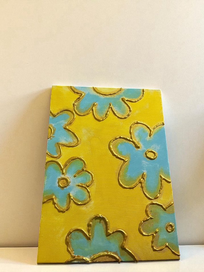 Pastel sarı zemin üzerinde mavi çiçeklerin yer aldığı, dokulu konturlarla süslenmiş yumuşak ve neşeli görünümlü tablo.