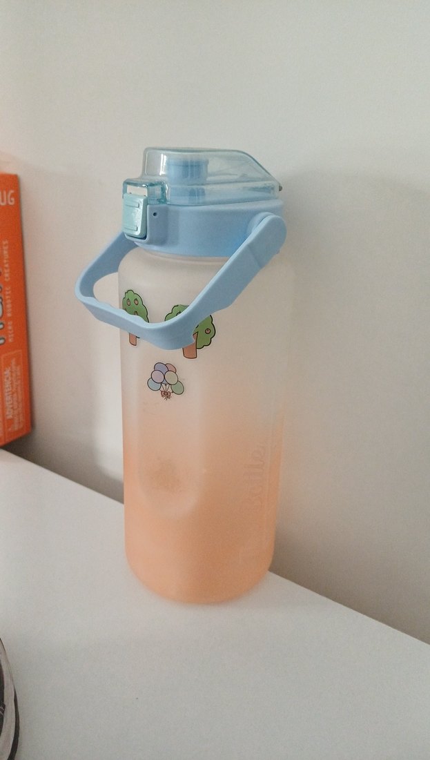 Mavi kulplu ve kapaklı, pastel bej renkli, ağaç ve balon desenli, Kolay kullanım için açılır kapaklı.