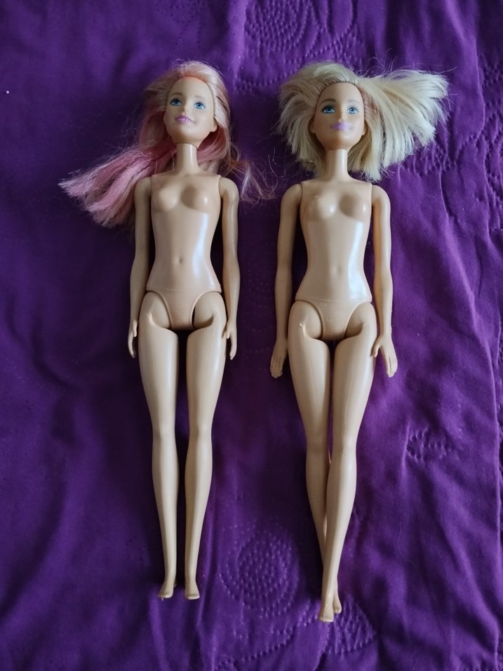 İki adet pastel renkli saçlı, eklemli bej tenli bebek seti. Yüz detayları ve uzun, yumuşak pastel tonlarda saçları vardır.