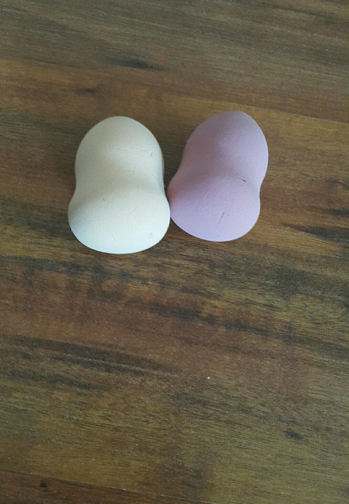 Bej ve açık mor pastel tonlarda 2 adet makyaj süngeri, pürüzsüz makyaj uygulaması için uygundur.