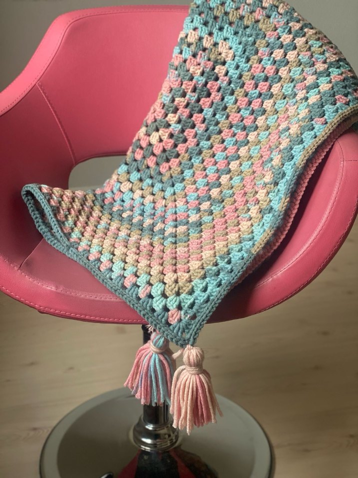 Püsküllü, batik desenli çok renkli pastel tonlarda el işi battaniye, sıcak ve dekoratif bir dokunuş sağlar. Siparişle yapılır. El örgüsüdür. Haki rengi hazırdır