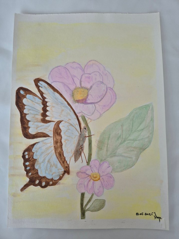 Pastel tonlarda, beyaz ve kahverengi kanatlı kelebek, pembe çiçekler ve yeşil yapraklar üzerinde duruyor. Yumuşak renk paletine sahip bir tablo. A4 boyut suluboya ÇERÇEVESİZ gönderilecektir