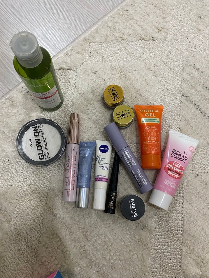 Pastel tonlarda, beyaz detaylı makyaj ürünleri seti. Highlighter, lip gel, maskara ve SPF koruyucu krem içerir. Ürünlerde 'AR' ve 'MOT' yazıları bulunur.