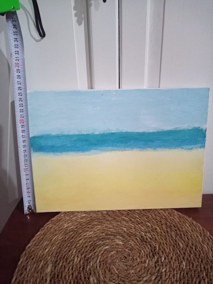 Pastel tonlarda, yumuşak mavi ve sarı renklerle sakin bir deniz manzarasını betimleyen tablo. Yumuşak renk geçişlerine sahip huzurlu bir ufuk resmi. Kullanılmamıştır. ihtiyaç fazlası olduğu için uygulamadadır.Ölçüləri resimde mevcuttur.Marka temsilidir.Alana hayırlı uğurlu olsun.✨✨