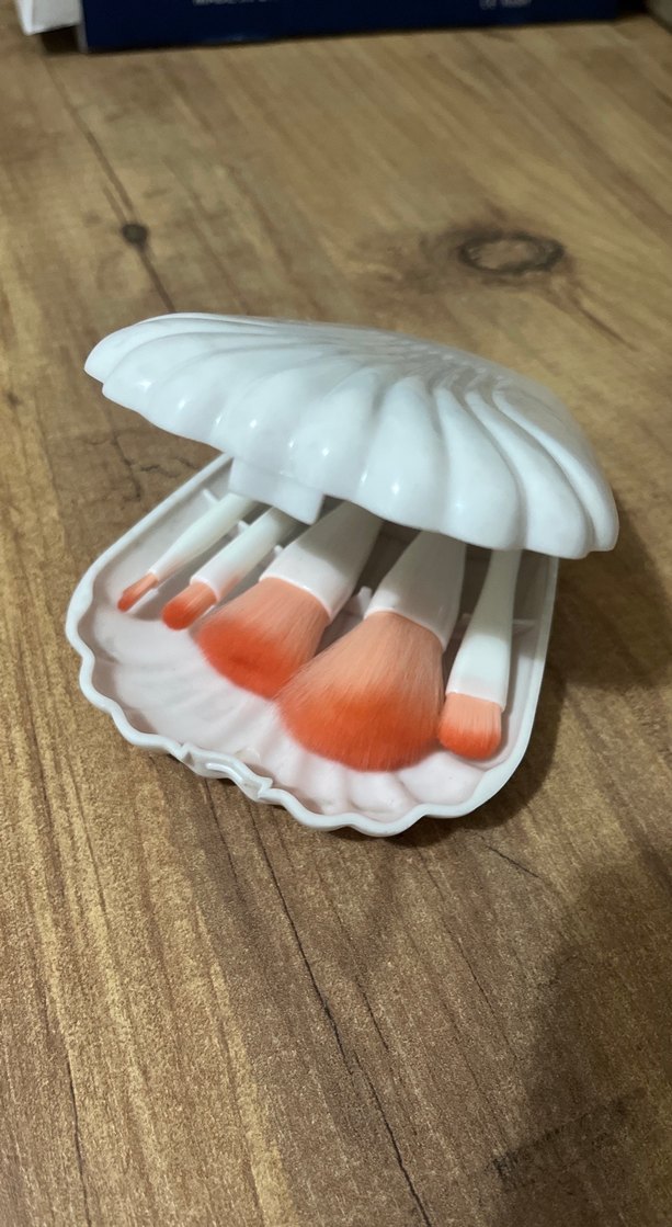 Pastel tonlu beyaz makyaj fırçası seti, yumuşak kıllara sahip ve kabuk şeklinde kutusunda sunuluyor. Sıfır ürün