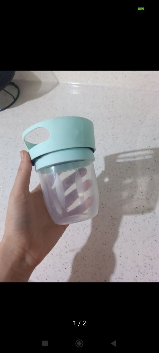 Pastel turkuaz renkte, kapağında taşıma kolaylığı sağlayan kulpu bulunan bebek biberonu. İçeriği rahatça görülebilir şeffaf hazne içerir.