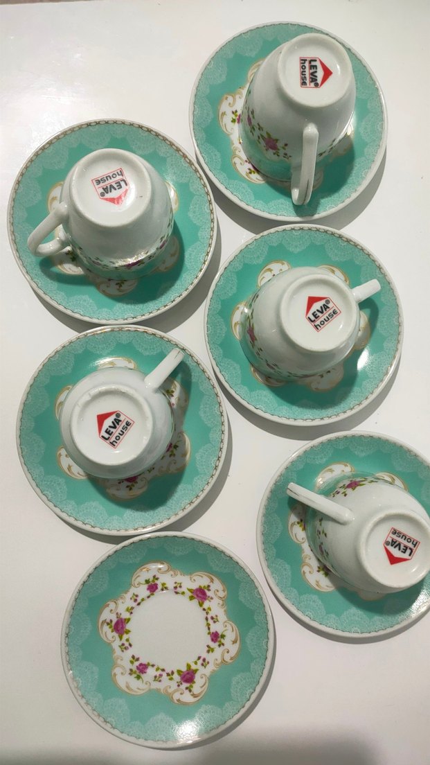 Pastel turkuaz renkte, çiçek desenli 6'lı fincan ve tabak takımı, çay veya kahve servisi için uygun. ☕