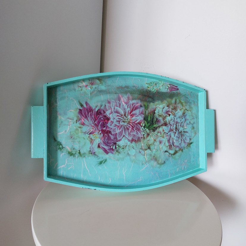 Pastel Turkuaz Çiçek Desenli Tepsi