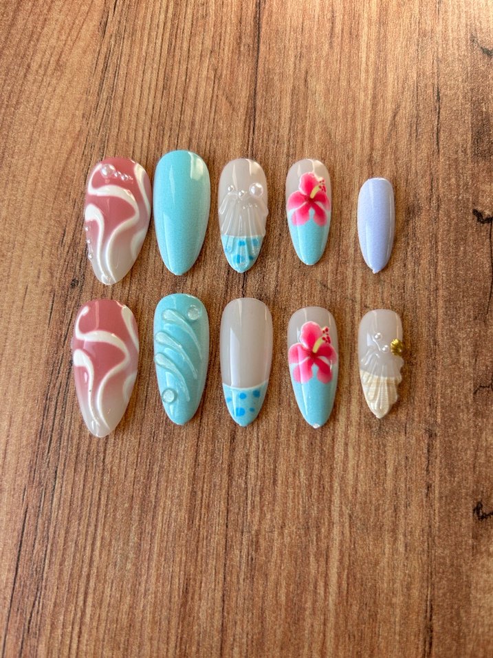 Pastel turkuaz renklerde, çiçek ve soyut desenlerle süslenmiş tırnak seti. Yaratıcı tasarımlar için uygun .