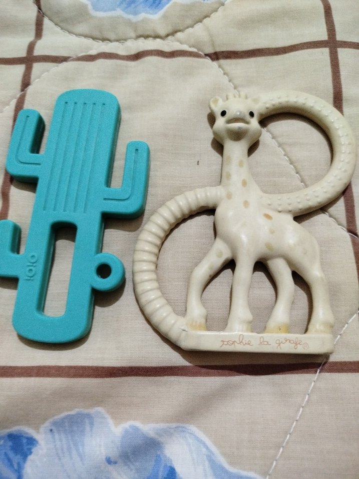 Pastel turkuaz kaktüs şeklinde diş kaşıyıcı ve dokulu saplı bej zilli zürafa oyuncak seti, bebeklerin rahatlaması için tasarlanmıştır.