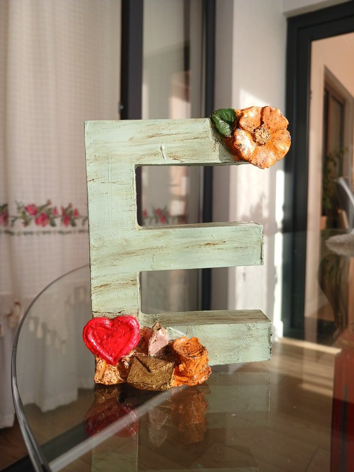 Pastel turkuaz renkte, 'E' harfi şeklinde dekorstif obje. Renkli çiçek ve kalp süslemeleri bulunur. ️ El boyamasıdır,marka temsili.