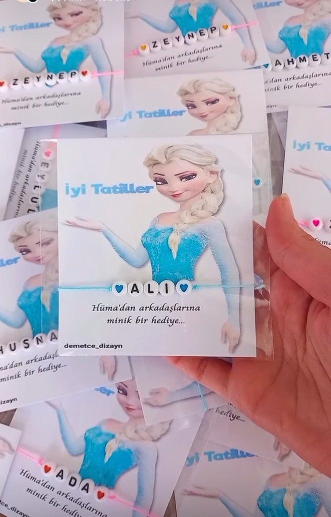 Pastel turkuaz renkte, Elsa figürlü çocuk hediyesi. Kişiye özel isim boncukları ve "İyi Tatiller" mesajıyla minik hediyeler için uygun. İstenilen konseptte kart hazırlanır. İki adet fiyatıdır #isimlibileklik