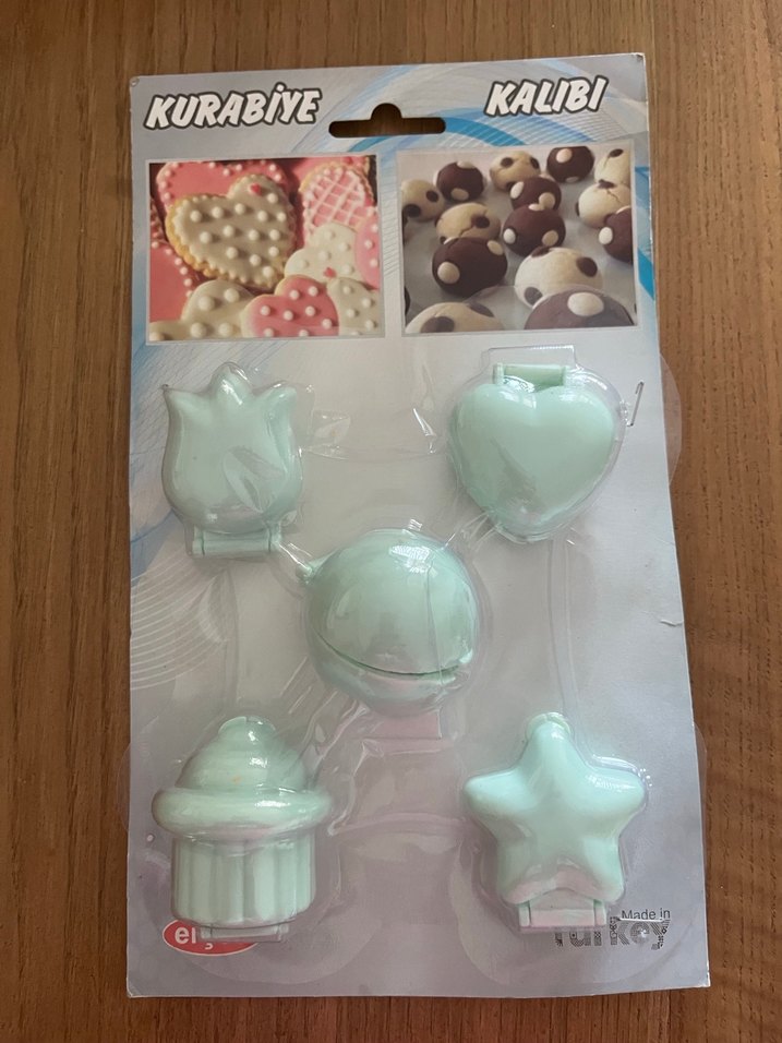Pastel turkuaz renkte, el ile şekillendirilebilen 5 farklı kurabiye kalıbı içerir.