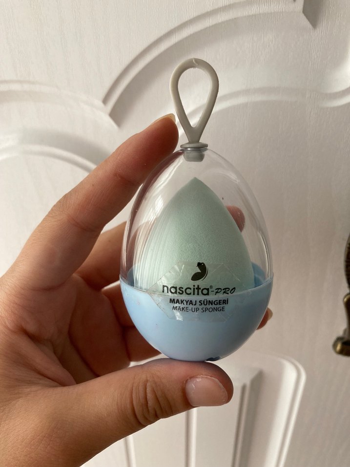 Pastel turkuaz renkte, yumuşak dokulu makyaj süngeri, şeffaf koruyucu kutuda. Üzerinde 'nascita-pzo' yazısı bulunur. Orjinal ürün