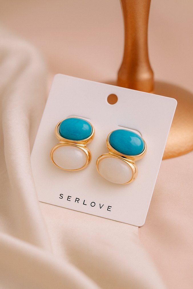Parlak turkuaz ve beyaz renkli mini küpeler, çağdaş tasarıma sahip. Romantik akşamlar için ideal, baskılı detaylı ve cesur minimalist tarzda.