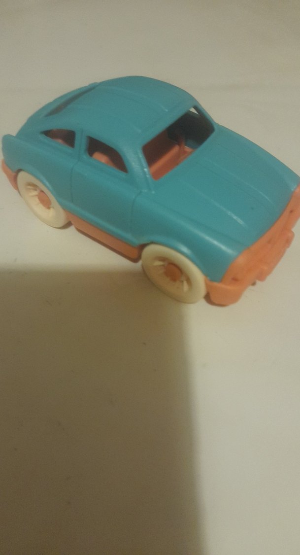 Pastel turkuaz renkli oyuncak araba, krem renkli tekerlekleri ve yuvarlak hatlarıyla dikkat çekiyor. Basit ve sevimli bir oyun aracı.