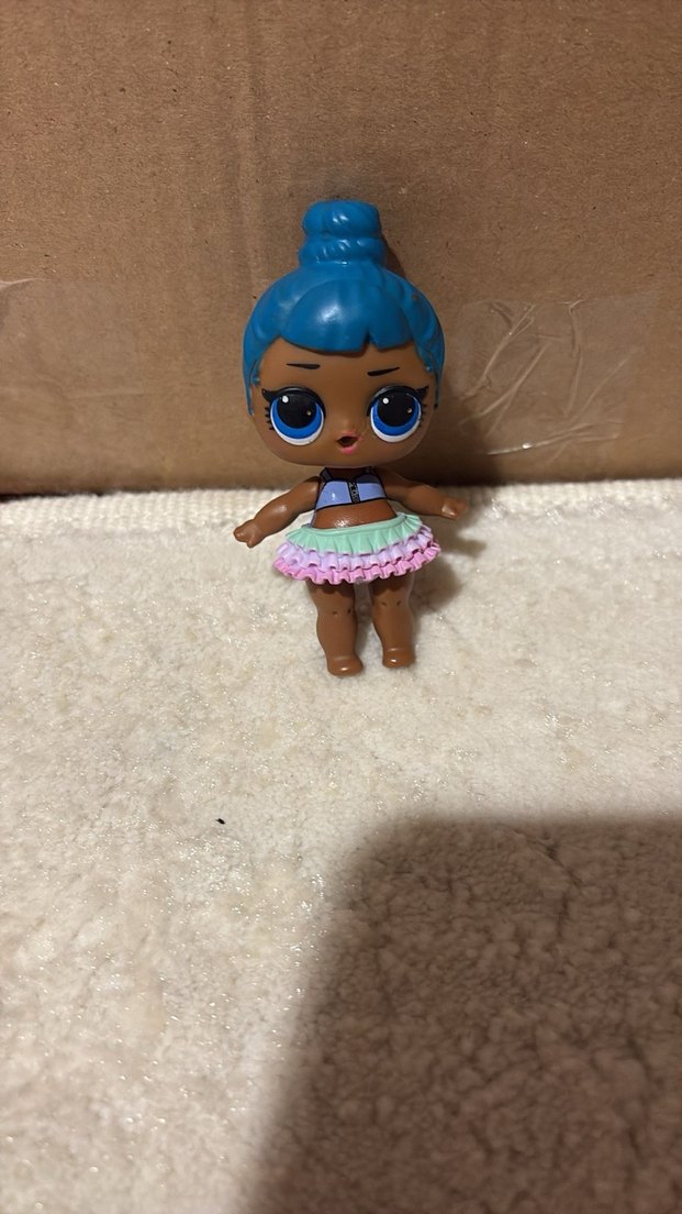 Pastel turkuaz saçlı, büyük gözlü ve pastel renklerde kıyafet giymiş küçük oyuncak bebek.