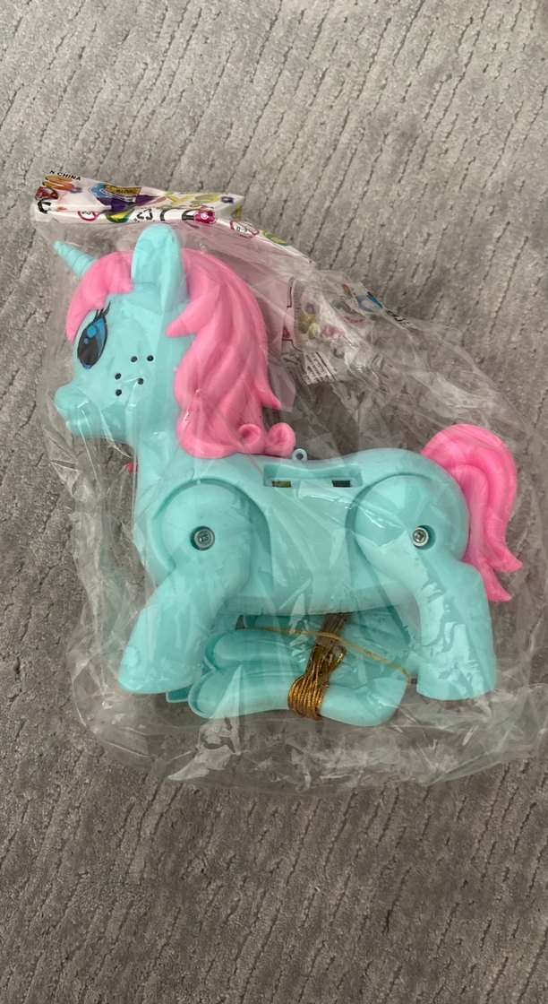 Pastel turkuaz renkte, pembe yele ve kuyruğa sahip hareketli parçalı unicorn figür. Sesli yürüyen