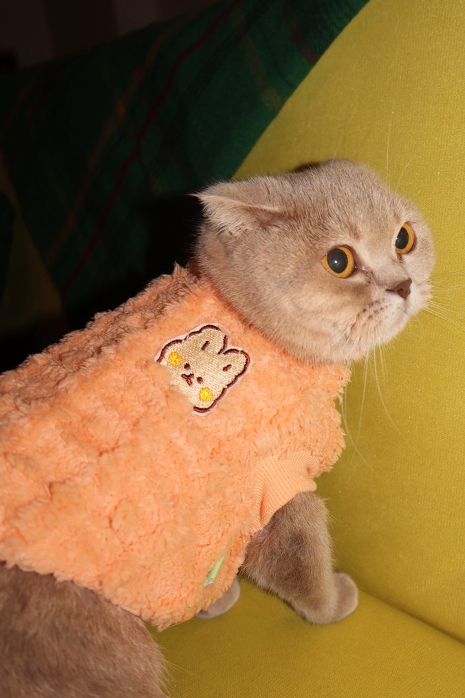 Yumuşak dokulu pastel turuncu kedi kıyafeti, sevimli tavşan işlemeli, kedinizin rahat ve şık kalmasını sağlar.