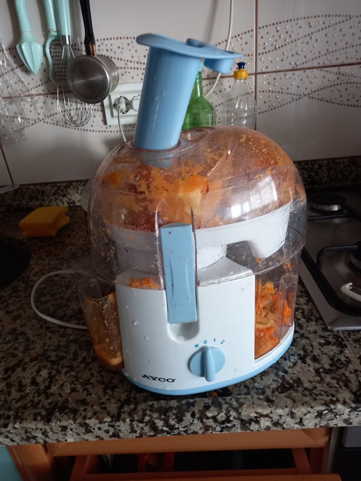 Pastel turuncu renkli meyve sıkacağı, şeffaf kapak ve mavi itici aparata sahiptir. Hız kontrol düğmesi ve meyve suyu toplama haznesi bulunur.