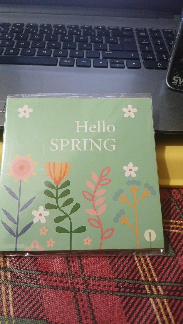 Pastel yeşil renkte, çiçek desenli ve 'Hello SPRING' yazılı kapaklı defter.