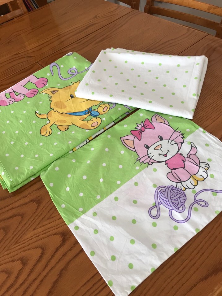 Pastel yeşil renkte, baskılı çizgi film kedileri bulunan yumuşak sentetik kumaştan çocuk uyku seti. Kullanılmış