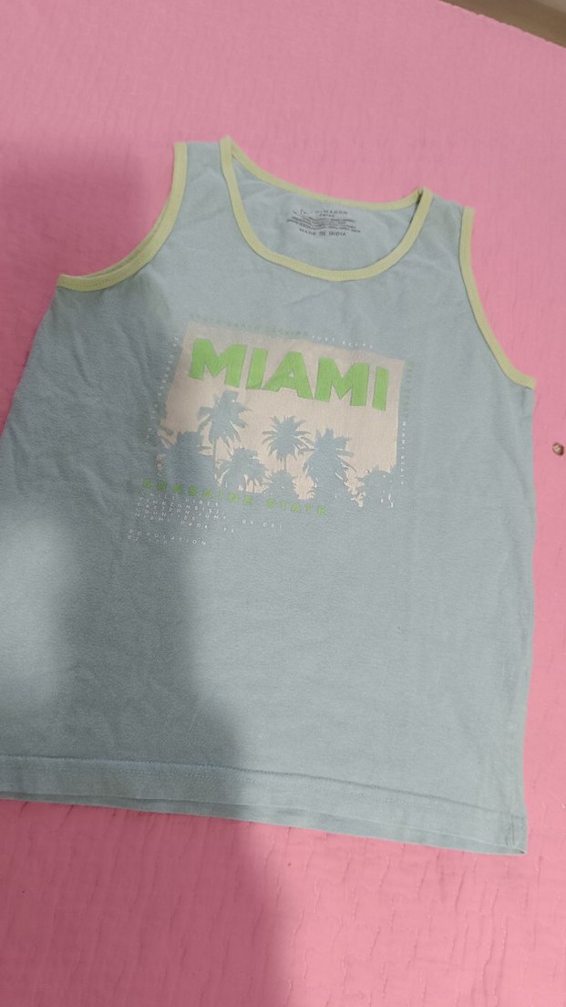 Pastel yeşil renkli, "MIAMI" yazılı ve palmiye ağaçları baskılı çocuk atlet. Yumuşak ve rahat kumaşlıdır.