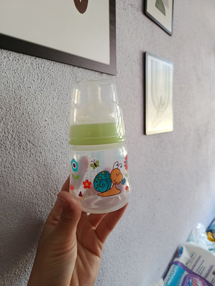 Pastel yeşil renkli, üzerinde sevimli salyangoz ve çiçek desenleri bulunan şeffaf bebek biberonu.