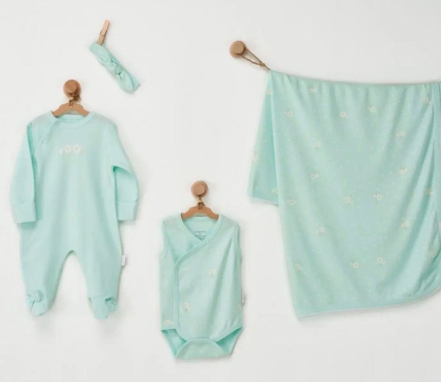Pastel yeşil renkte, sargılı body, ayaklı tulum, saç bandı ve battaniyeden oluşan rahat bebek hastane kıyafeti seti. Sıfırdan farksız