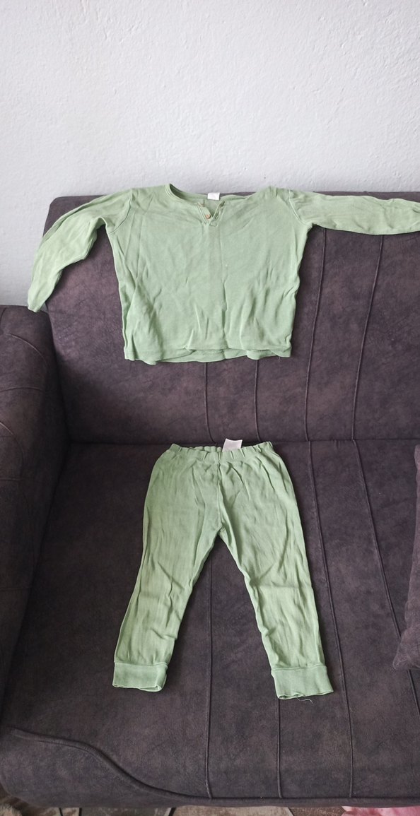 Pastel yeşil, uzun kollu üst ve kruvaze yaka ile birlikte yumuşak ve sıcak kumaştan yapılmış, rahat bir bebek takımı.