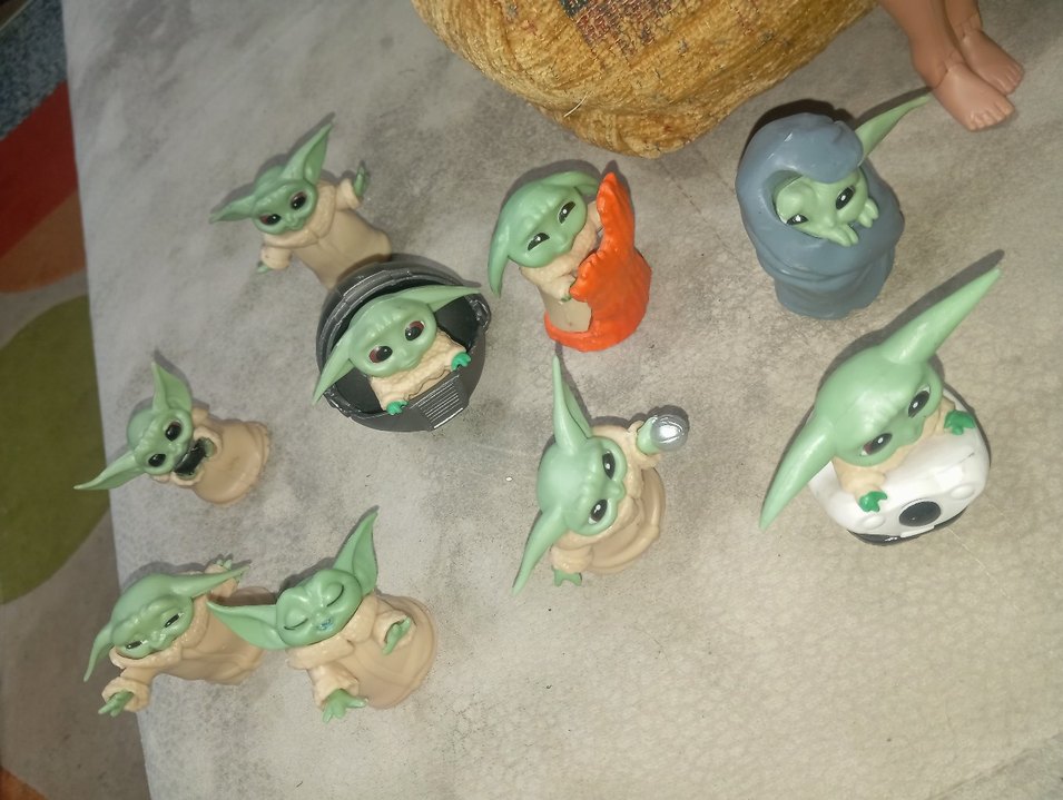 Pastel yeşil Bebek Yoda aksiyon figürleri, farklı pozlarda; nesne tutan ve kapsülde oturan figürler bulunur. Yumuşak pastel renkler detayları vurgular. Ürünler fotoğraflarda gördüğünüz gibi gönderilecektir detaylar için iletişime geçiniz diğer bebekler için sayfamı ziyaret etmeyi unutmayın ☺️