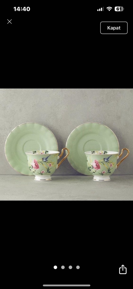 Pastel yeşil çiçek desenli iki fincan ve uyumlu tabaklar. Her fincan altın renkli kulpa sahip, zarif bir tasarım sunar. ☕engilshhome