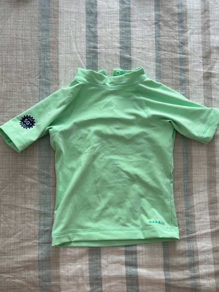 Pastel yeşil renkli, kısa kollu, arkası çıtçıtlı yüksek yakalı çocuk içliği. SPF 50+ güneş koruması sağlar, yumuşak ve pürüzsüz kumaştan üretilmiştir.