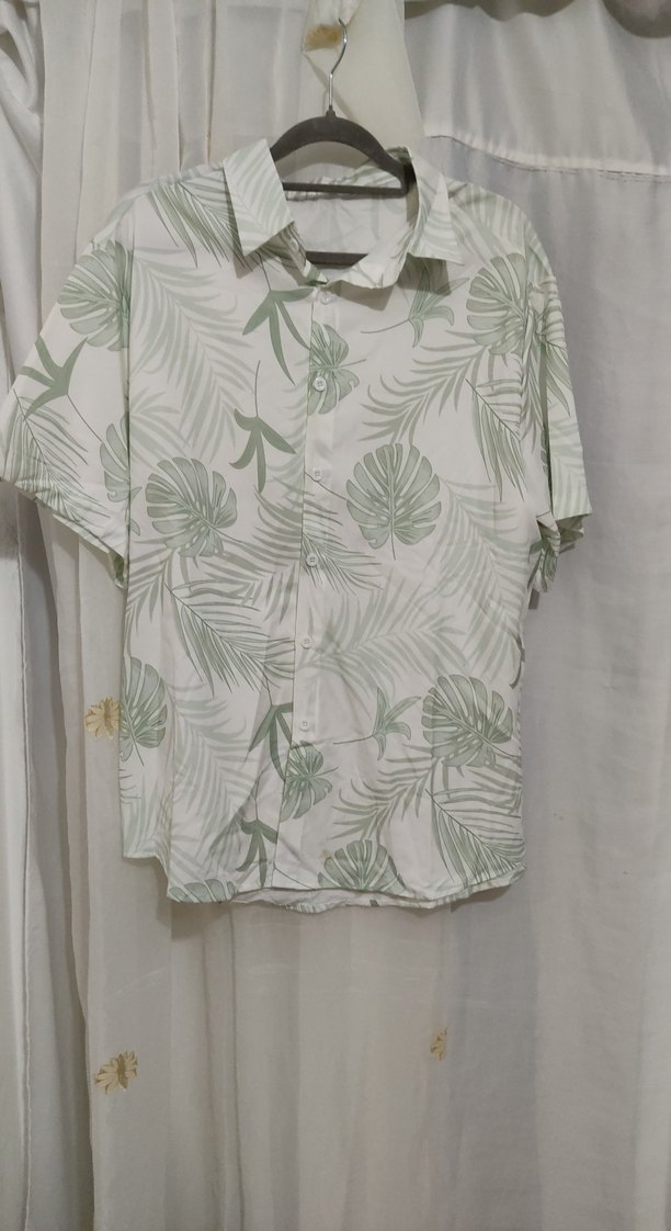 Yumuşak sentetik kumaştan, pastel yeşil yaprak desenli, düğmeli kısa kollu, yakalı ve bol kesim erkek gömleği. Kısa boy ve günlük rahatlık için uygun.