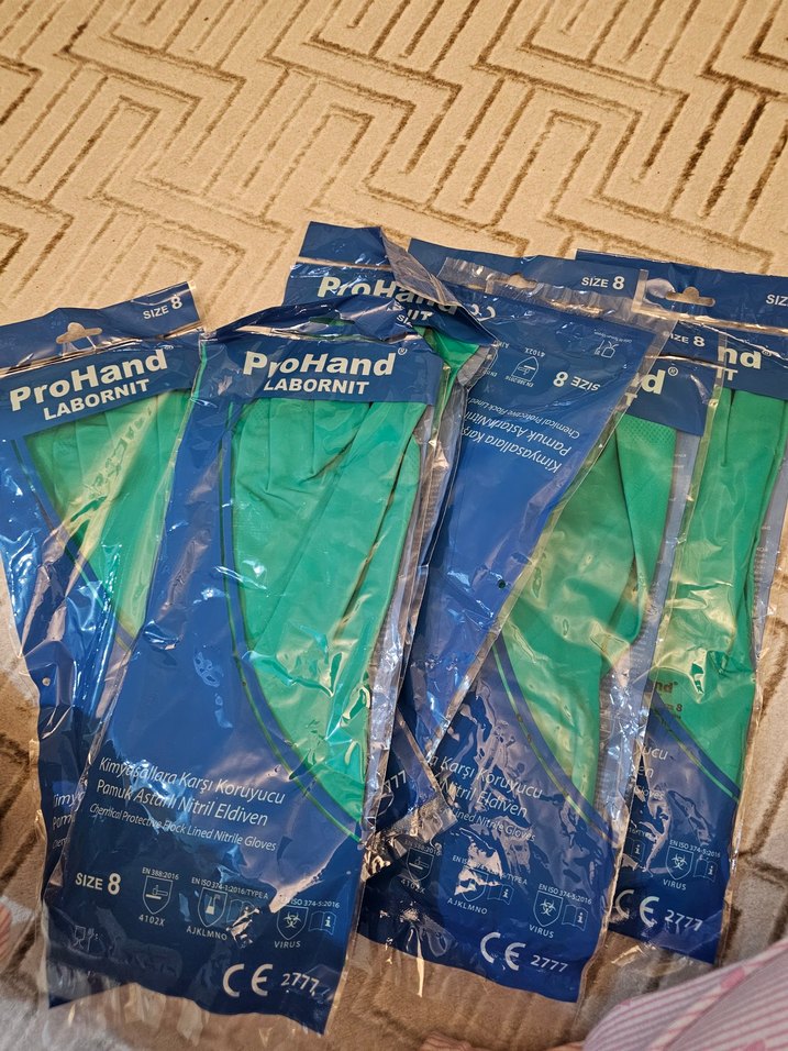 Pastel yeşil renkte, desen içermeyen ProHand marka eeldivenler. 8 numara, LABORNIT etiketli. Tanesi 200 tldir.Evinde bosuna durduğu icin 100tlden vericem toplam 700tldir.