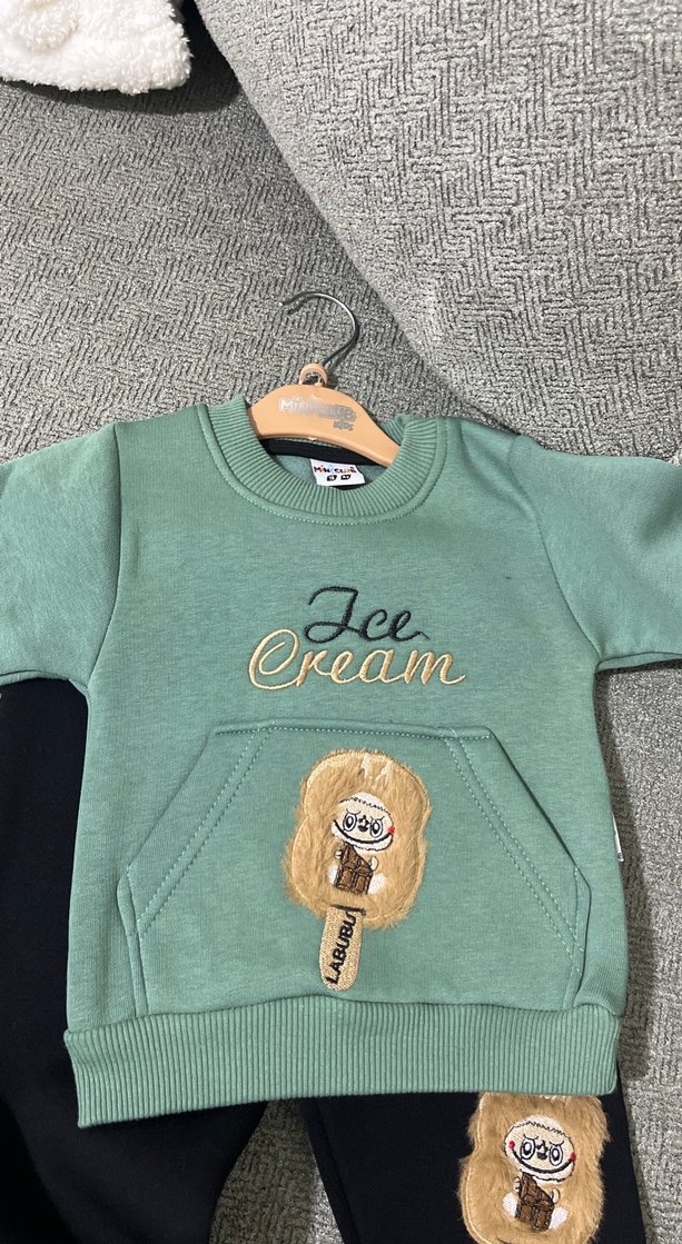 Pastel yeşil renkli, yuvarlak yakalı ve uzun kollu erkek bebek sweatshirtü. Yumuşak, sıcak kumaş ve örme detaylar ile ön cepte baskılı dondurma figürü bulunur.