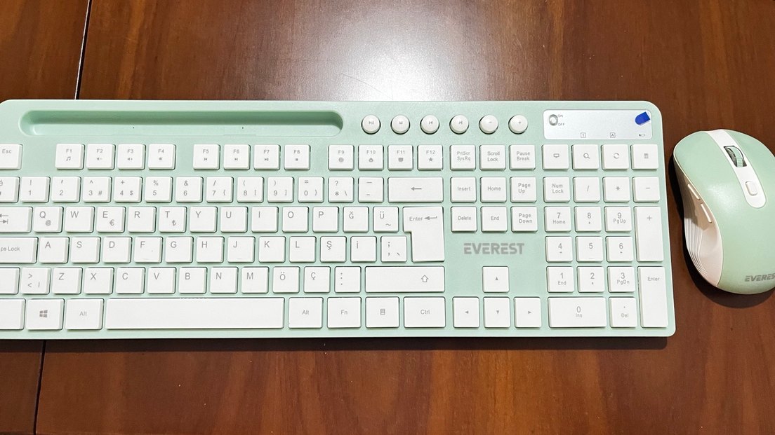 Everest markalı kablosuz pastel yeşil renkte, beyaz tuşlara sahip klavye, multimedya düğmeleri içerir. ⌨️