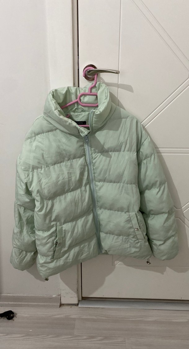 Pastel yeşil renkte, fermuarlı, yüksek yakalı kadın kışlık ceket. Uzun kollu ve rahat kesimli, dış mekan kullanımı için uygundur. ✨